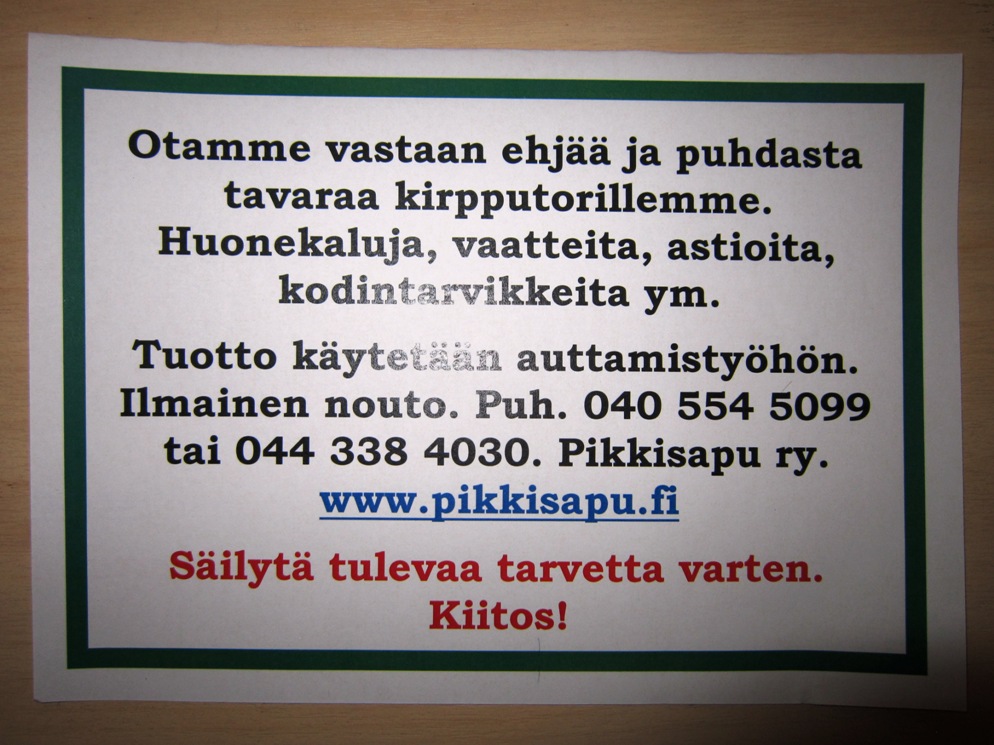 Pikkis Puoti Kirpputori. Kausantie 15, Nastola. Puh. 044 338 4030.